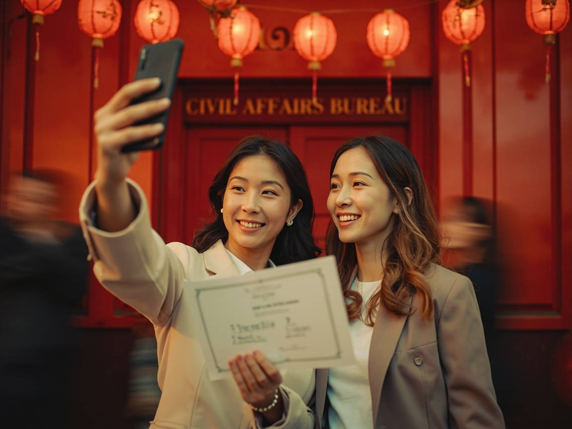 转过天,阿哲在民政局门口撞见了短视频里的那对00后。男孩正帮女孩整理被风吹乱的头纱——那是他们结婚时戴的同款。"拍张照吧,好歹算毕业纪念。"女孩举着手机,镜头里两人笑得比结婚证上还灿烂。阿哲想起自己抽屉里那张过期的电影票,当年和前女友因为谁该买婚房首付吵到分手,如今她孩子都能打酱油了。