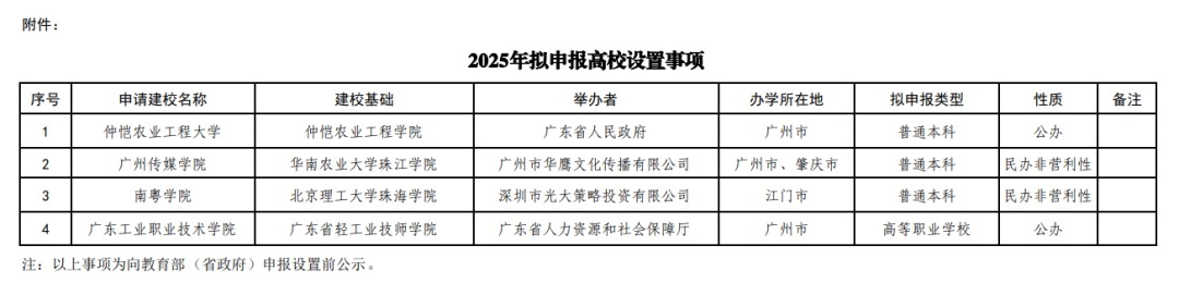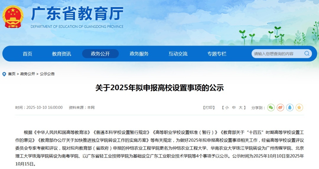 10月10日,广东省教育厅公示,拟向教育部(省政府)申报仲恺农业工程学院更名为仲恺农业工程大学、华南农业大学珠江学院转设为广州传媒学院、北京理工大学珠海学院转设为南粤学院、以广东省轻工业技师学院为基础设立广东工业职业技术学院。公示时间为2025年10月10日至2025年10月15日。这意味着,仲恺农业工程学院“改大”有了新进展;广东省轻工业技师学院性质也将变为公办高等职业学校。
