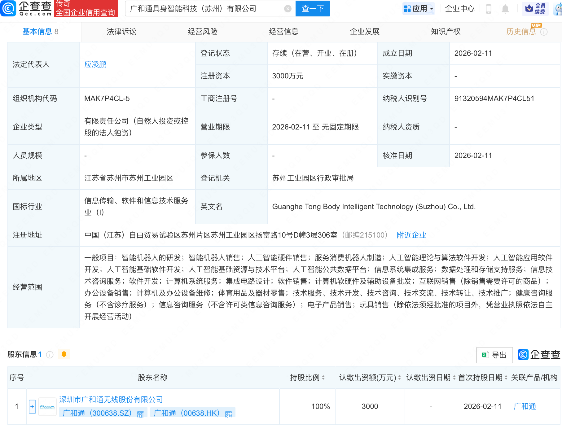 企查查APP显示配资投资,近日,广和通具身智能科技(苏州)有限公司成立,注册资本3000万元,经营范围包含:智能机器人的研发;智能机器人销售;人工智能硬件销售;服务消费机器人制造;人工智能理论与算法软件开发等。企查查股权穿透显示配资投资,该公司由广和通(300638.SZ)全资持股。